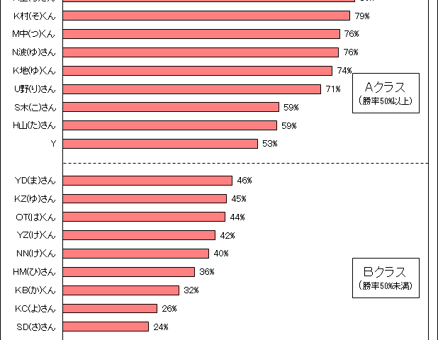 今夜のシングルス練習に参加くださった皆さん、お疲れ様でした。 M谷(し)さん、H本(ひ)くん(大1)は、1年以上ぶりにご参加くださいました。 M谷(し)さんがAクラス(勝率50%超)入りしました。おめでとうございます。