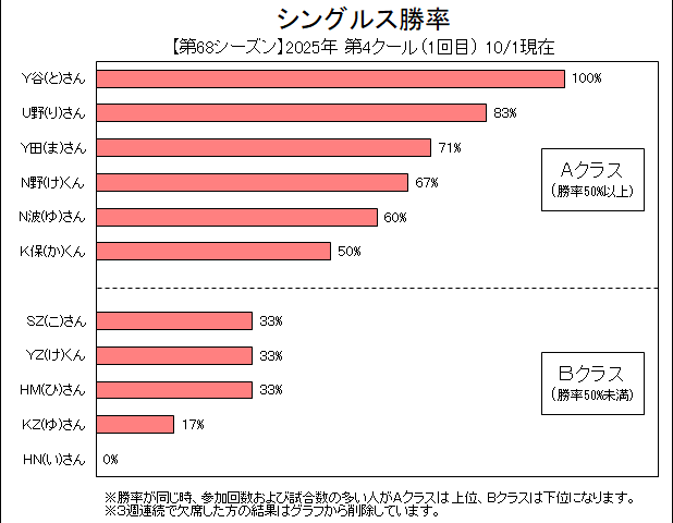 今夜のシングルス練習に参加くださった皆さん、お疲れ様でした。 先週までの最終勝率で【第68シーズン】2025年第4クールを開始しました。 Y田(ま)さん、N野(け)くん(中2)、K保(か)くん(中2)がAクラス(勝率50