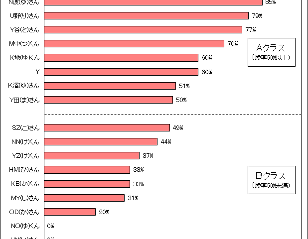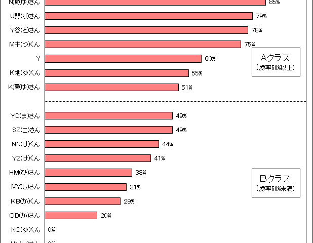 今夜のシングルス練習に参加くださった皆さん、お疲れ様でした。 S木(こ)さんがAクラス(勝率50%超)入りしました。おめでとうございます。 ◆参加者数:11名 (中学生2名,高校生2名,20歳代1名,30歳代2名,40歳