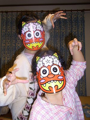 昨夜は節分。家族で恵方巻きを食べ、そのあと豆まきをしました。 娘達は鬼になった気分です。