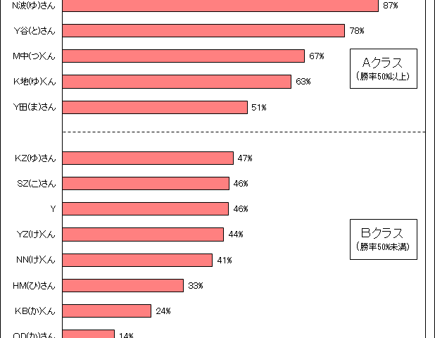 昨夜のシングルス練習に参加くださった皆さん、お疲れ様でした。 Y田さんがAクラス(勝率50%超)入りしました。おめでとうございます。 ◆参加者数:9名 (中学生1名,高校生2名,20歳代2名,30歳代1名,40歳代2名,
