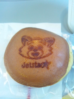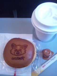 更に、真ん中の価格帯のチケットを購入したためドリンクなどで使える500円分のクーポンが付いて、ジェットスターの焼き印付きのどら焼とホットコーヒーのセットをクーポンで頂きました(写真)。