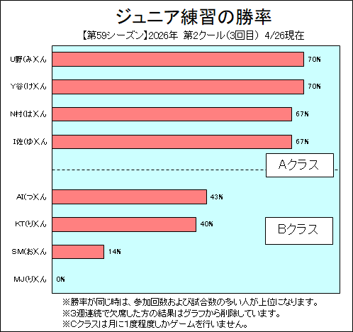 N村(は)くん(小6)がAクラス(勝利50%超)入りしました。おめでとうございます。