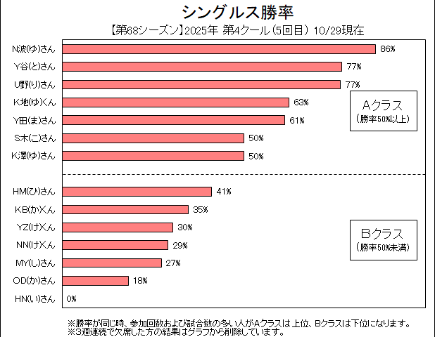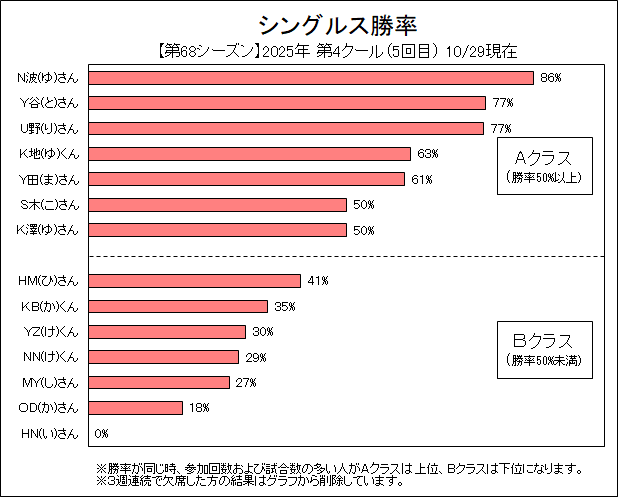 K澤(ゆ)さんがAクラス(勝率50%超)入りしました。おめでとうございます。