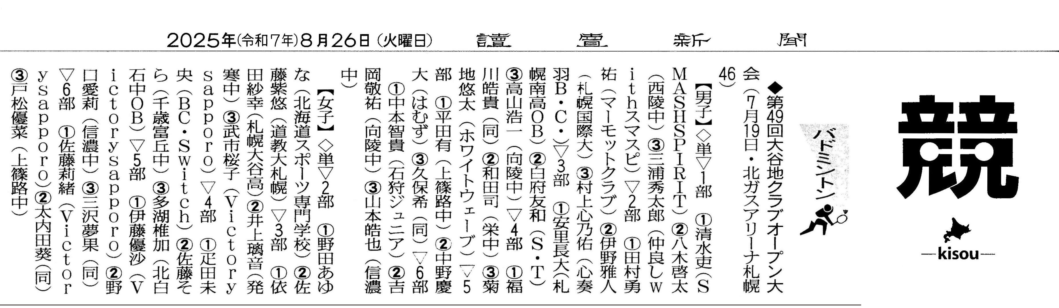 読売新聞(北海道版)に、2025年7月19日(土)開催「第49回大谷地クラブオープンバドミントン大会(個人戦)」の結果が掲載されました。