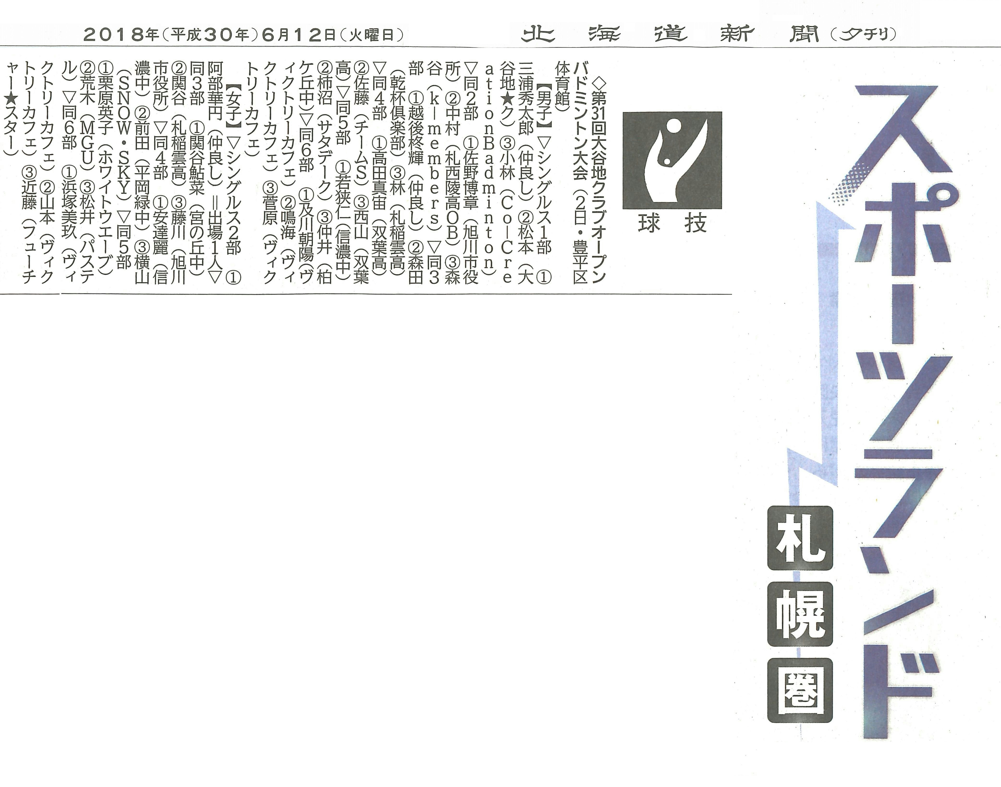 大会結果(北海道新聞,札幌版 6/12(火)夕刊)
