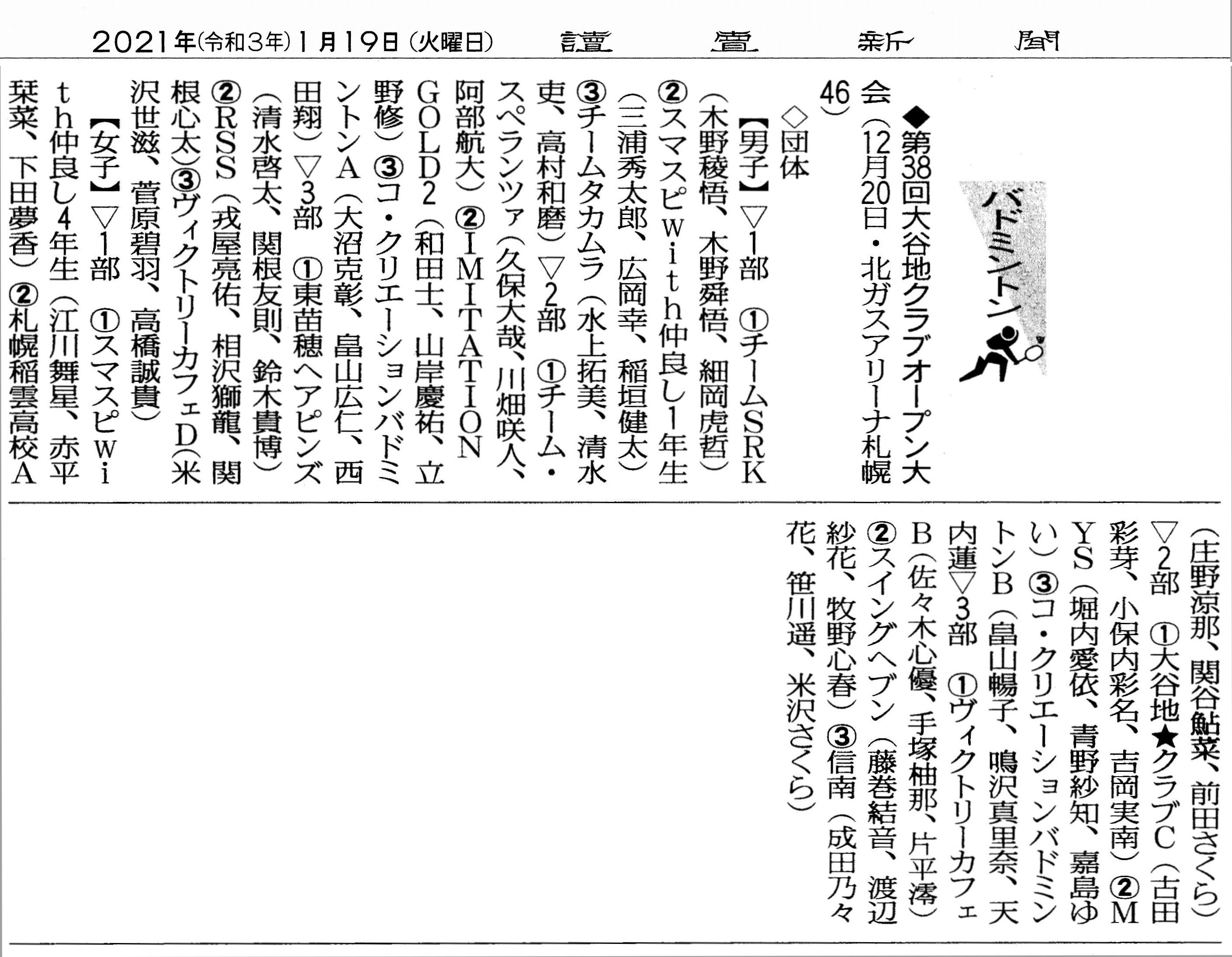 大会結果掲載【読売新聞(全道版,1/19(火)朝刊)】