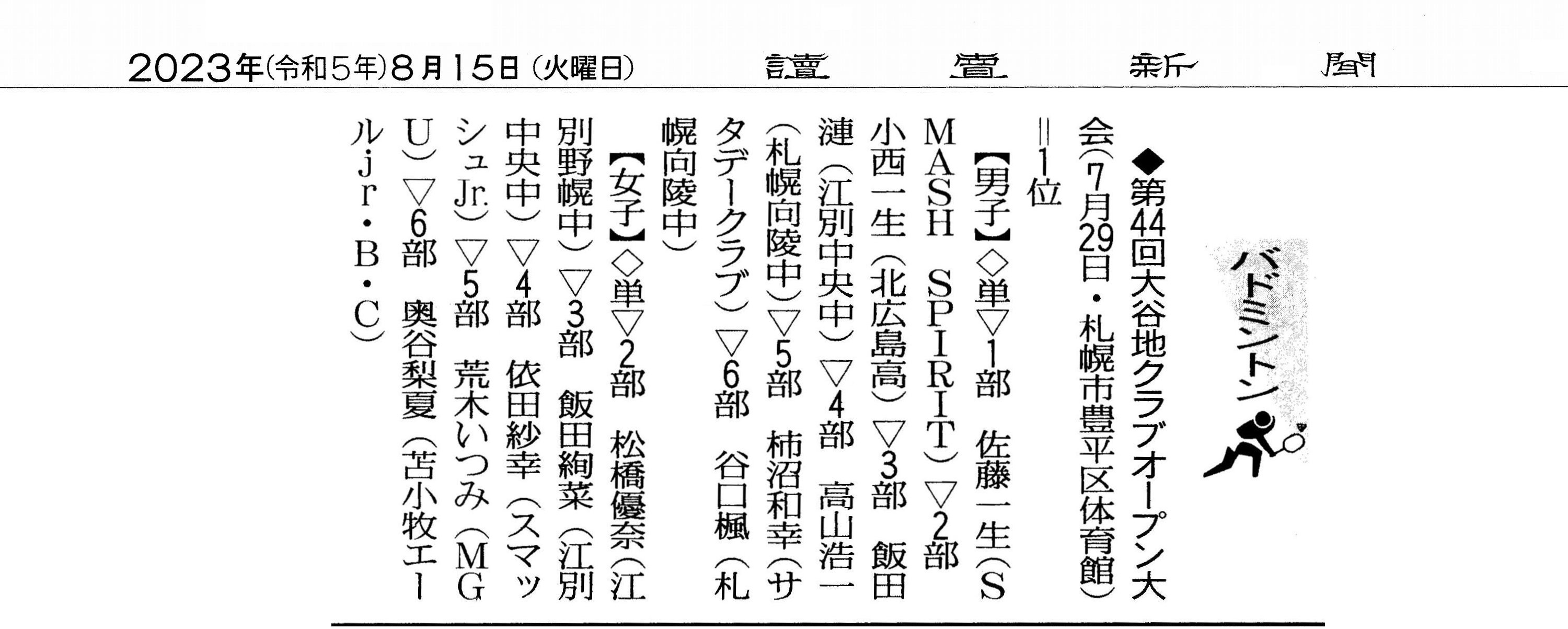 大会結果掲載【読売新聞(全道版,8/15(火)朝刊)】