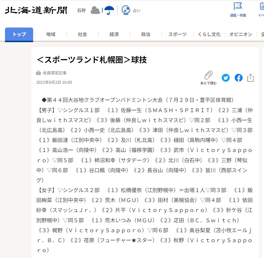 大会結果掲載【北海道新聞(デジタル版=電子版)】