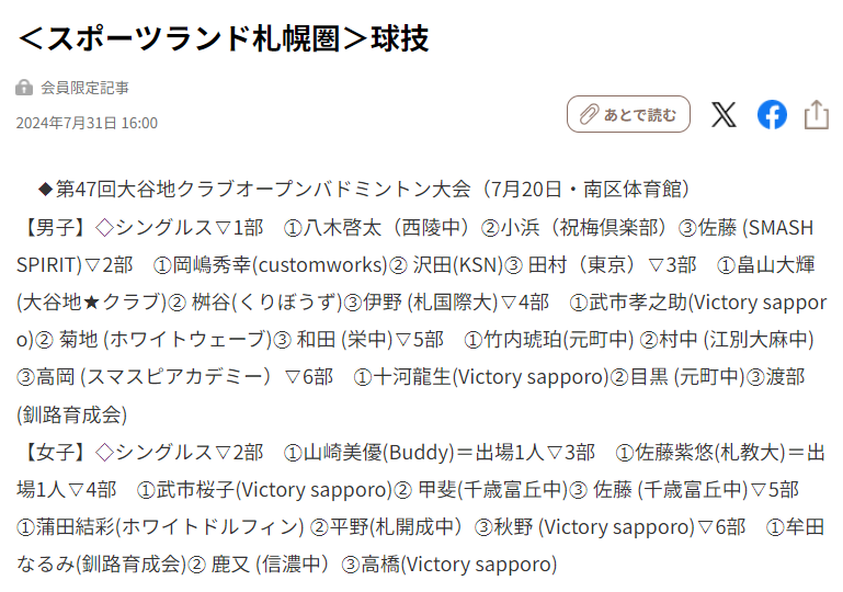 大会結果掲載【北海道新聞(デジタル版=電子版)】