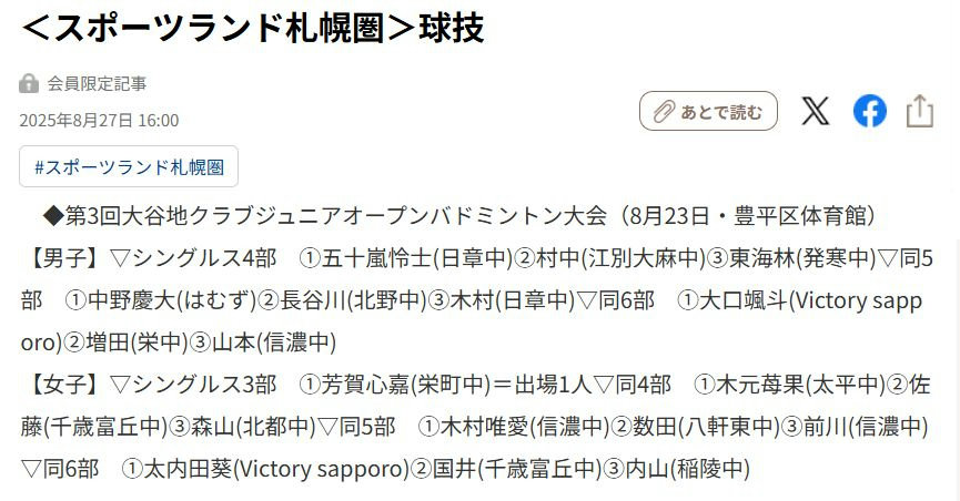 大会結果掲載【北海道新聞(デジタル版=電子版)】